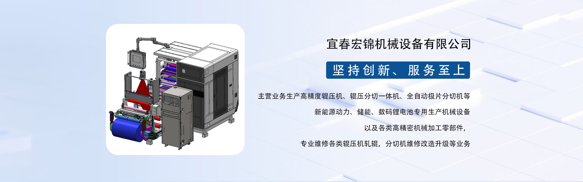 東莞市宏錦機(jī)械科技有限公司江西分公司是一家集研發(fā)、生產(chǎn)、銷售、服務(wù)于一體的創(chuàng)新型鋰電自動化精密機(jī)械設(shè)備專業(yè)制造、服務(wù)商,坐落于江西省新余市渝水區(qū)新余經(jīng)濟(jì)開發(fā)區(qū)孵化園5號廠房,廠房面積近6000平米,由東莞市宏錦機(jī)械科技有限公司于2024年11月投資新建,交通區(qū)位優(yōu)勢明顯、產(chǎn)業(yè)配套便捷集中,擁有一批具有行業(yè)豐富經(jīng)驗(yàn)的技術(shù)人員和管理團(tuán)隊(duì)。公司主營業(yè)務(wù)生產(chǎn)高精度輥壓機(jī)、輥壓分切一體機(jī)、全自動極片分切機(jī)等新能源動力、儲能、數(shù)碼鋰電池專用生產(chǎn)機(jī)械設(shè)備以及各類高精密機(jī)械加工零部件,專業(yè)維修各類輥壓機(jī)軋輥,分切機(jī)維修改造升級等業(yè)務(wù)。根據(jù)公司發(fā)展三步走戰(zhàn)略規(guī)劃經(jīng)營現(xiàn)下設(shè)三個二級獨(dú)立運(yùn)營事業(yè)部分別為分切事業(yè)部(分切機(jī)、輥壓分切一體機(jī))、磨輥事業(yè)部(輥壓機(jī)、軋輥修磨)、機(jī)加事業(yè)部(精密機(jī)械部件加工)。經(jīng)過十余年沉淀發(fā)展主要客戶有新余贛鋒、南昌維科、宜春清陶、云南路華、河南恒一、江西程疆、四川天萊、蕪湖天弋、惠州億緯鋰能、無錫盤古新能源、鄭州比克、安徽鋰天下、臺灣長利(宏基集團(tuán))、重慶維都利(紫建電子)、贛州諾威、安徽利維能、漳州萬寶、重慶佳寶成、廣西皇冠儲能等一批具有行業(yè)知名度和影響力的企業(yè)。公司在新能源發(fā)展的道路上堅(jiān)持創(chuàng)新,為客戶帶來穩(wěn)定、高效的自動化專用設(shè)備和更大的收益。